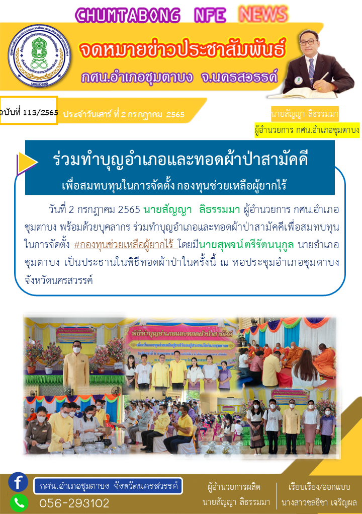 วันที่ 2 กรกฎาคม 2565 นายสัญญา ลิธรรมมา ผู้อำนวยการ กศน.อำเภอชุมตาบง พร้อมด้วยบุคลากร ร่วมทำบุญอำเภอและทอดผ้าป่าสามัคคี เพื่อสมทบทุนในการจัดตั้ง กองทุนช่วยเหลือผู้ยากไร้ โดยมีนายสุพจน์ ตรีรัตนนุกูล นายอำเภอชุมตาบง เป็นประธานในพิธีทอดผ้าป่าในครั้งนี้ ณ หอประชุมอำเภอชุมตาบง จังหวัดนครสวรรค์