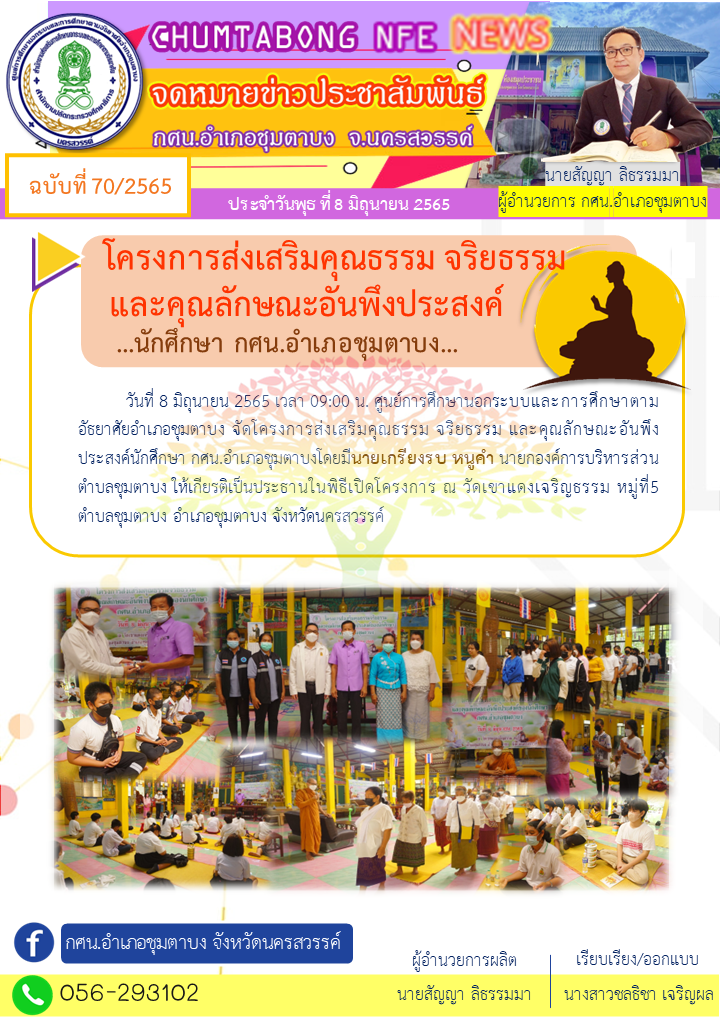 วันที่ 8 มิถุนายน 2565 เวลา 09:00 น. ศูนย์การศึกษานอกระบบและการศึกษาตามอัธยาศัยอำเภอชุมตาบง จัดโครงการส่งเสริมคุณธรรม จริยธรรม และคุณลักษณะอันพึงประสงค์นักศึกษา กศน.อำเภอชุมตาบงโดยมีนายเกรียงรบ หนูคำ นายกองค์การบริหารส่วนตำบลชุมตาบง ให้เกียรติเป็นประธานในพิธีเปิดโครงการ ณ วัดเขาแดงเจริญธรรม หมู่ที่5 ตำบลชุมตาบง อำเภอชุมตาบง จังหวัดนครสวรรค์