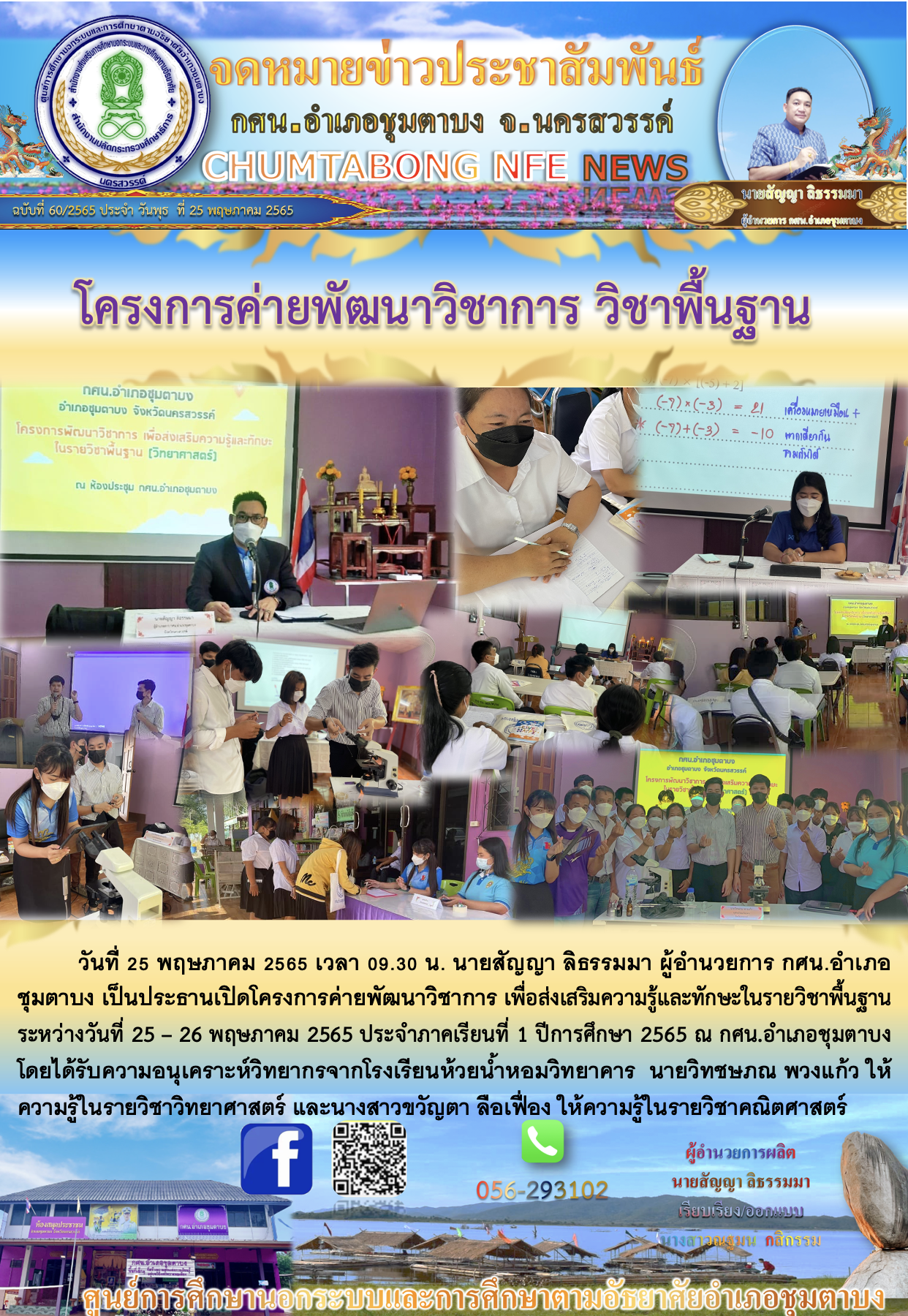 วันที่ 25 พฤษภาคม 2565 เวลา 09.30 น. นายสัญญา ลิธรรมมา ผู้อำนวยการ กศน.อำเภอชุมตาบง เป็นประธานเปิดโครงการค่ายพัฒนาวิชาการ เพื่อส่งเสริมความรู้และทักษะในรายวิชาพื้นฐาน ระหว่างวันที่ 25 – 26 พฤษภาคม 2565 ประจำภาคเรียนที่ 1 ปีการศึกษา 2565 ณ กศน.อำเภอชุมตาบงโดยได้รับความอนุเคราะห์วิทยากรจากโรงเรียนห้วยน้ำหอมวิทยาคาร นายวิทชษภณ พวงแก้ว ให้ความรู้ในรายวิชาวิทยาศาสตร์ และนางสาวขวัญตา ลือเฟื่อง ให้ความรู้ในรายวิชาคณิตศาสตร์