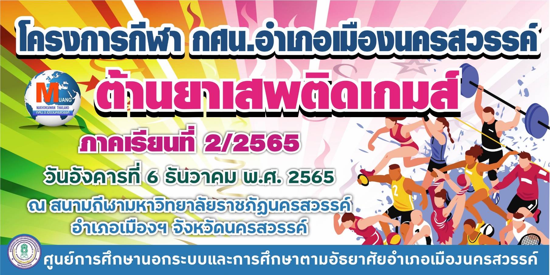 ขอเรียนเชิญประชาชนผู้สนใจ ร่วมชมการแข่งขันกีฬา กศน.เกมส์ กศน.อำเภอเมืองนครสวรรค์ ต้านยาเสพติด ในวันอังคารที่ 6 ธันวาคม 2565 ณ สนามกีฬามหาวิทยาลัยราชภัฏนครสวรรค์ โดยมีการแข่งขันกีฬาประเภทต่างๆ ได้แก่ ฟุตซอล วอลเล่ย์บอล เซปักตระกร้อ เปตอง กรีฑา และ กีฬาพื้นบ้าน