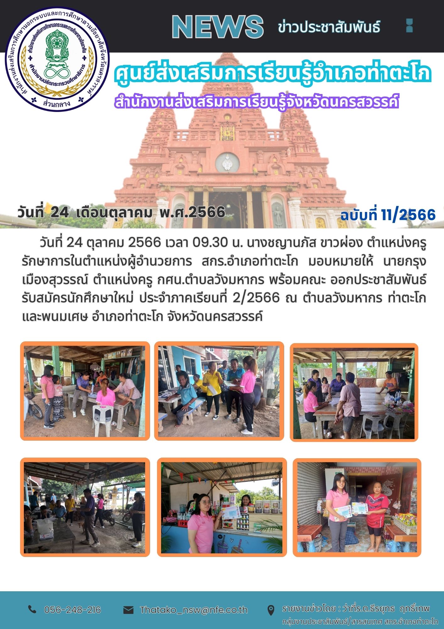 วันที่ 26 ตุลาคม 2566 เวลา 10.00 น. นางชญานภัส ขาวผ่อง ตำแหน่งครู รักษาการตำแหน่งผู้อำนวยการ กศน.อำเภอท่าตะโก